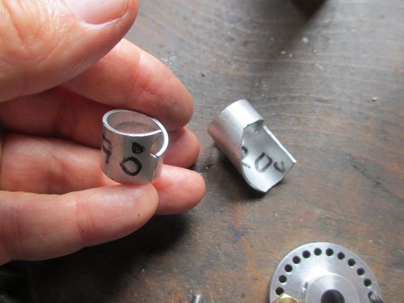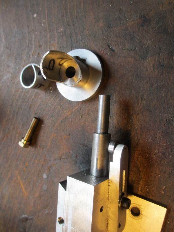 je découpe le triangle et le colle bien d'équerre sur le bout de tube patrone, les 2 extrémités sont bien jointives. Je scie suivant la pente en suivant le tracé et fignole à la dremel et meulette, la section doit être bien lisse car c'est la surface de roulement de la butée. Les patrones sont fixées par une vis sur le guide, qui tourne librement sur la tige, c'est le disque avec les trous d'indexation qui lui est fixé sur la tige et assure la rotation de l'ensemble avec la goupille dans les trous.
