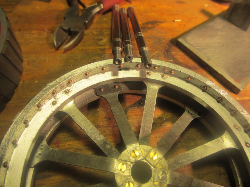 Je viens de terminer la remise en état : une roue avant et une roue arrière entièrement refaite J’ai usiné des jantes de roue arrière et avant à partir d’aluminium de bon aloi, et réutilisé les anciennes pièces en acier et laiton des moyeux, rayons et fers des semelles, en bon état; bien sûr, il a fallu refaire des supports de montage.