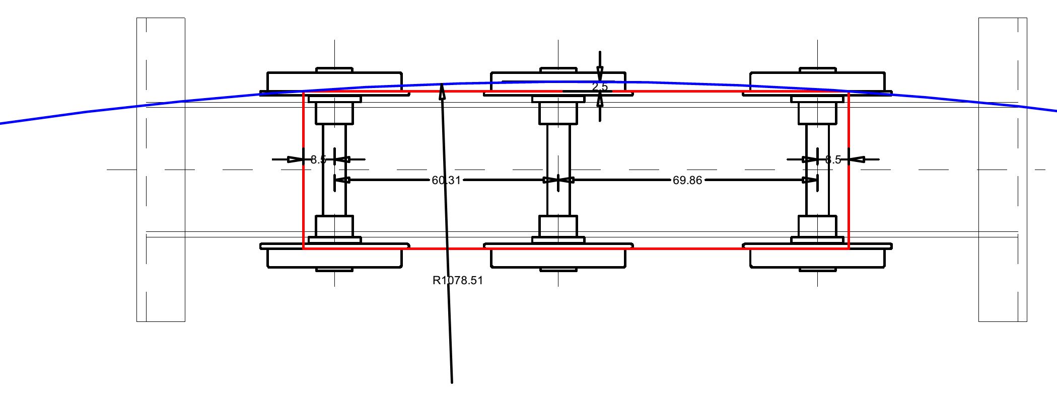 Il faut ajouter à l’empattement des roues les plus extérieures une longueur qui doit permettre aux boudins de roues de passer au dessus du rail, c’est simplement la ½ corde sur le cercle du diamètre total de la roue à la hauteur du rail, le théorème de Pythagore donne cette longueur.