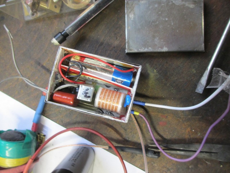 la loco a bien tourné, sans trucages, et devant témoins, mais hélas j'ai du lui ajouter un wagon d'accompagnement pour loger l'allumage : une bobine et une pile.