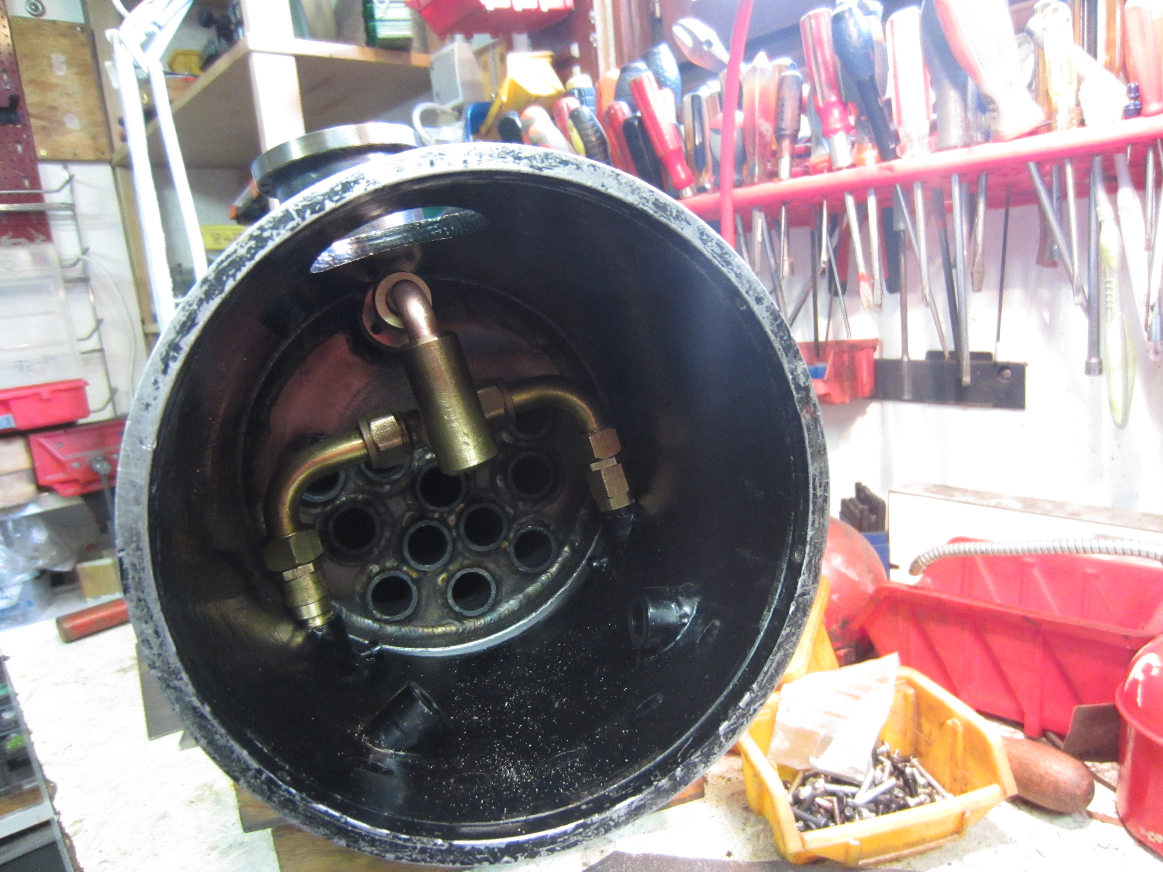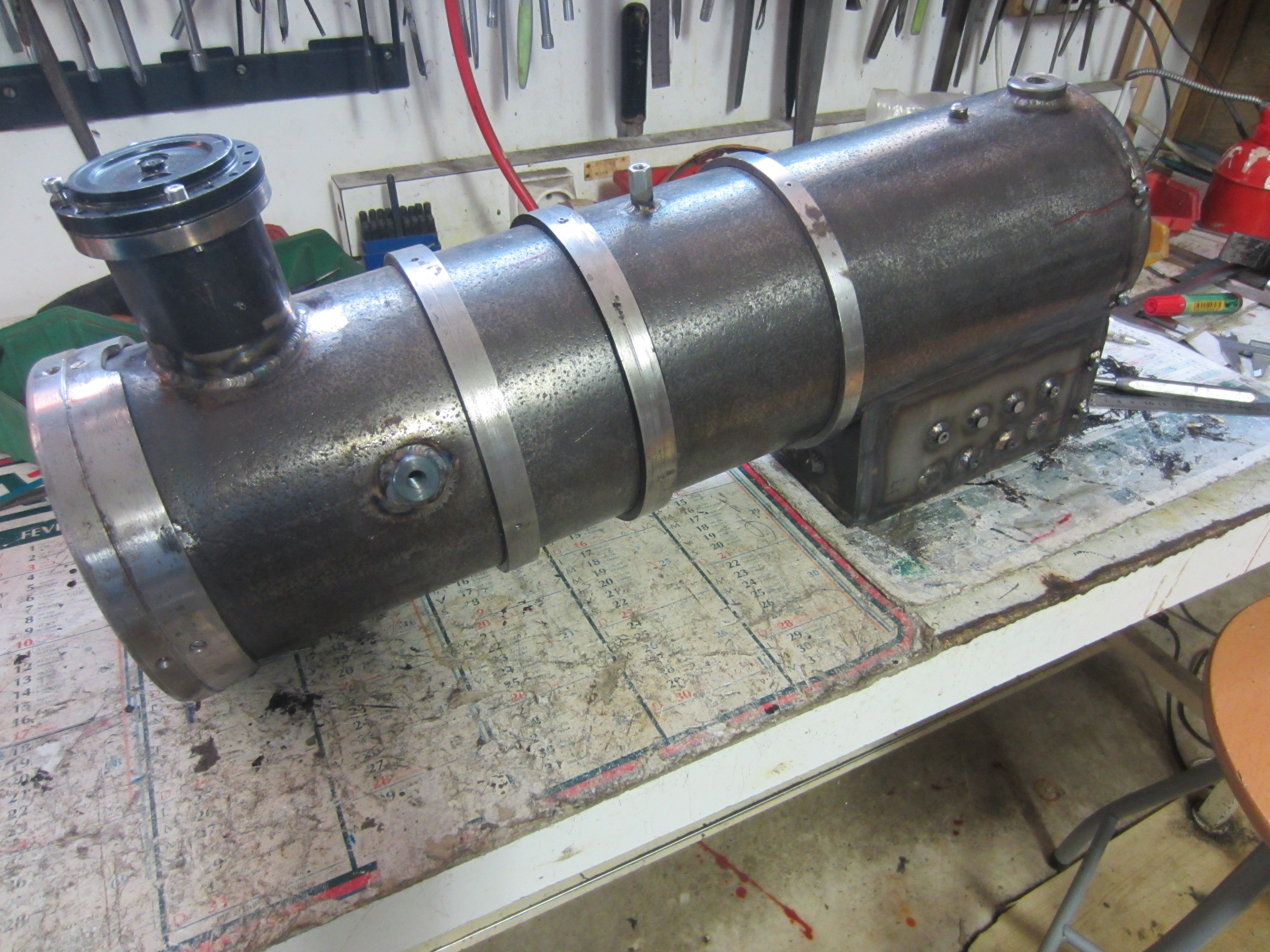 et bien voila , la chaudiere est finie a 99,99% (la prise d'eau gauche a ete perdue )et le soudeur part en vacances , 20 minutes d'usinage et 15 minutes de soudage , ce serra 100% mi aout....