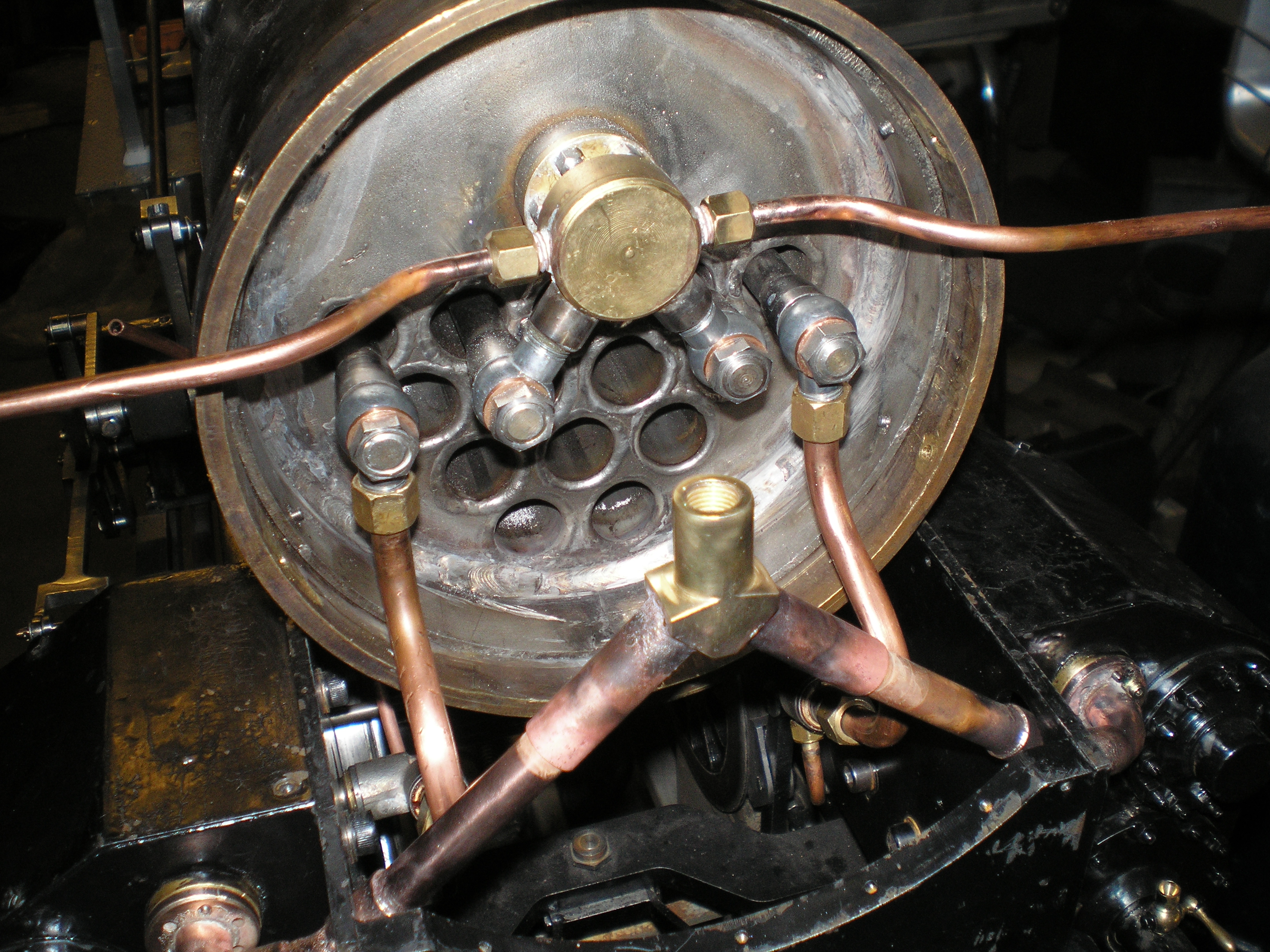 je n'ai pas l'intention d'apprendre cette technique , je trouverais bien un jour ! avant d'amener la chaudiere pour les dernieres soudures j'ai travaillé la tuyauterie et fait un montage a blanc...c'est plutot serré !