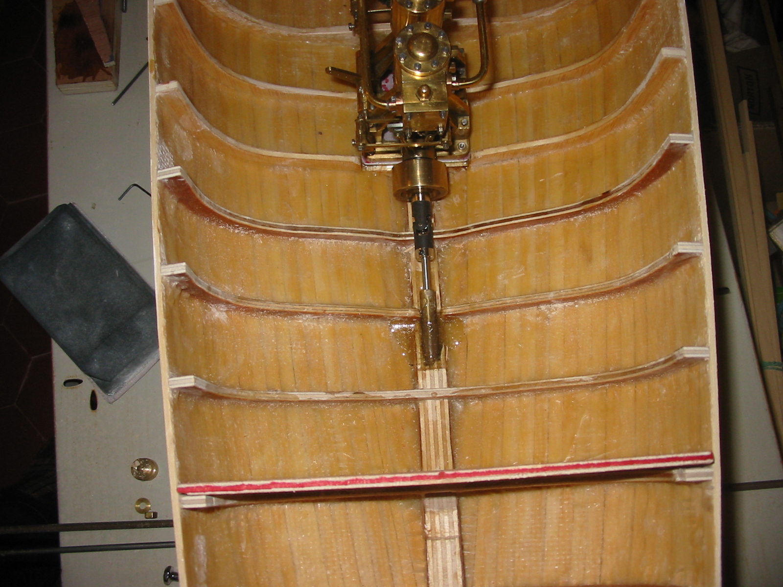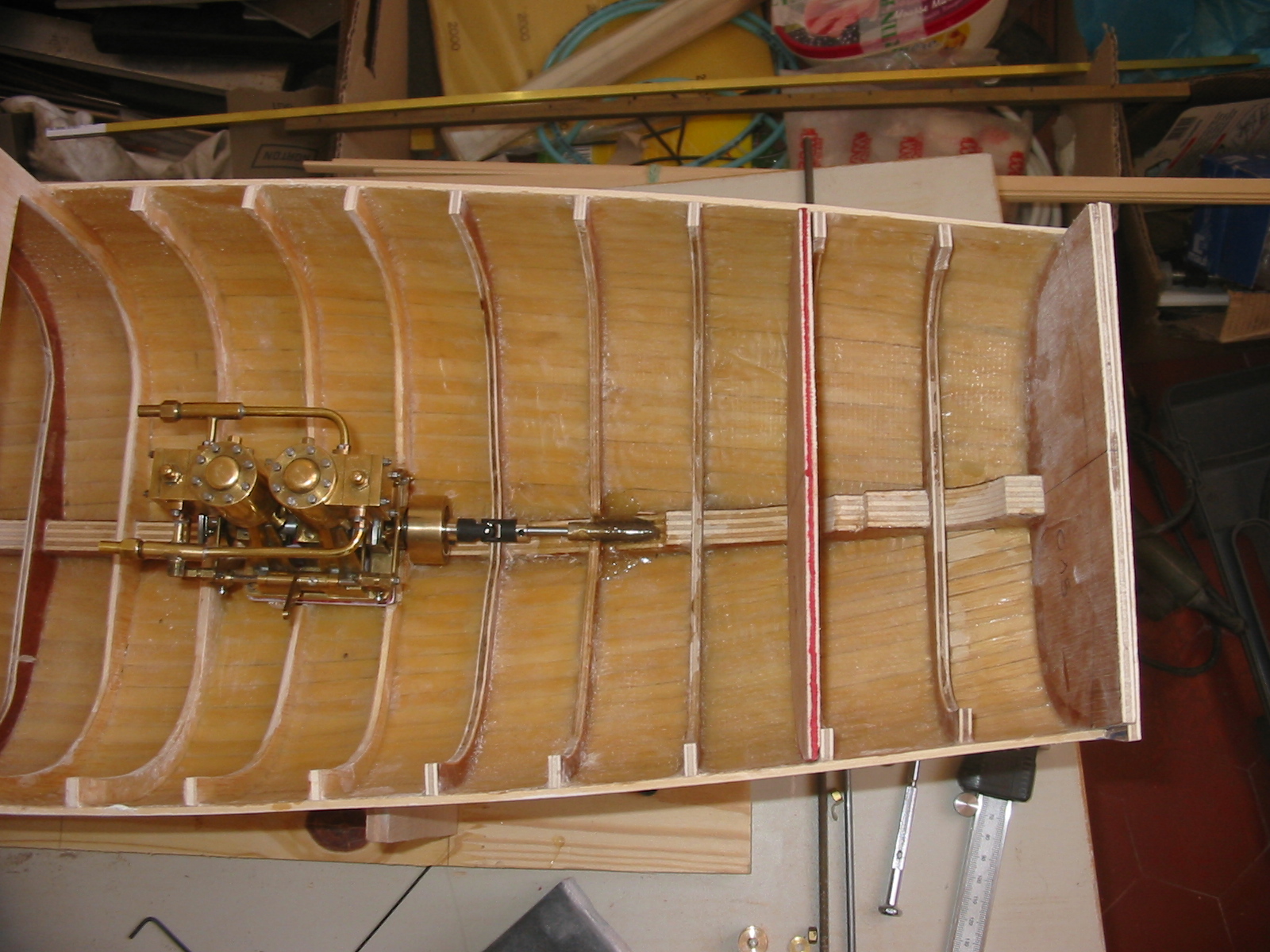 - Je positionne ensuite la chaudière remplie et tous les accessoires (déshuileur, tank, accus, servos...) dans la coque et la pose sur l'eau pour qu'elle soit à peu près dans sa ligne de flottaison.
