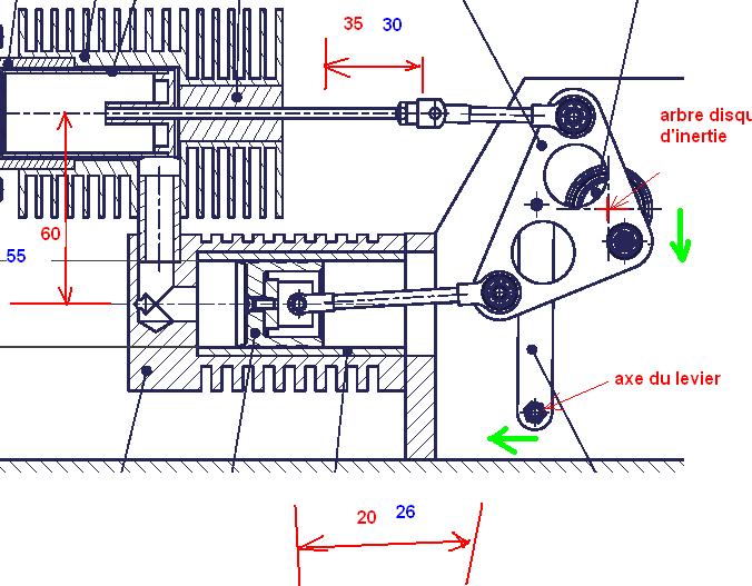 Une solution approchée par la trigo est facile pour une figure comme celle du moteur montré plus haut si on suppose que le pivot de la base du triangle se déplace en ligne droite et pas en arc de cercle, (comme sur le moteur à vapeur de Bernay). Il faut donc choisir un levier de longueur suffisante (disons 5 fois la course) pour minimiser cette approximation, et avec le point de fixation du triangle très légèrement supérieur à la hauteur de l'arbre, pour que le pivot se trouve "en moyenne" à la hauteur de l'arbre.