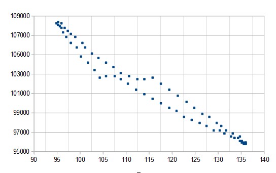 On peut voir sur le graphe que lorsque la pression avoisine la pression environnante la membrane se déforme dans l’autre sens et pendant un court instant le volume varie alors que la pression varie très peu… ou même varie légèrement en sens inverse car l’inertie de l’eau en mouvement favorise la variation de pression et volume. On s'en doutait mais je suis content de voir que la mesure le confirme.