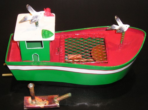 Premiers essais en bassin ce matin. Il flotte, il avance, et il fait pop-pop. La coque est une ancienne boite de biscuits bretons (minimum 25% de beurre) achetée le mois dernier sur ebay. Il a suffi de faire quelques petites modifications: étanchéité, peinture, inversion des feux pour respecter la réglementation, et ajout de 200g de lest.