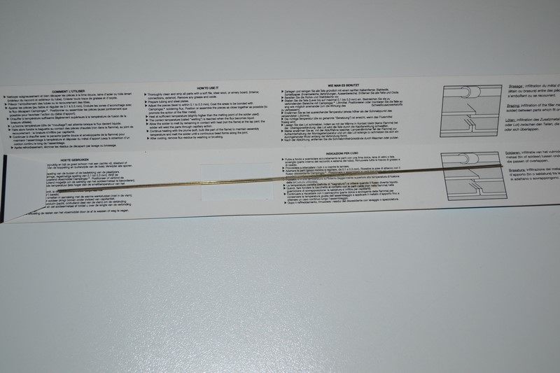 pour éviter ma déconvenue à d'autres modélistes je vous informe qu'après de nombreuses recherches dans différentes GSB j'ai trouvé de la brasure d'argent dont les caractéristique sur l'emballage semblaient intéressantes:teneur en argent 34% diamètre 0.8mm longueur 350mm brasure spécialement dédiée au maquettisme.