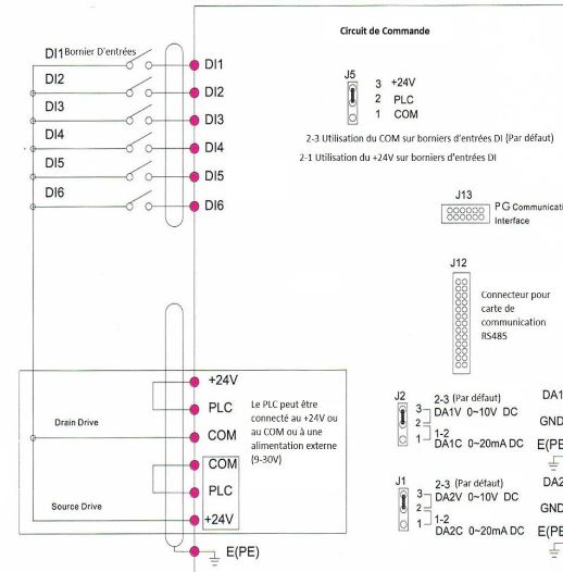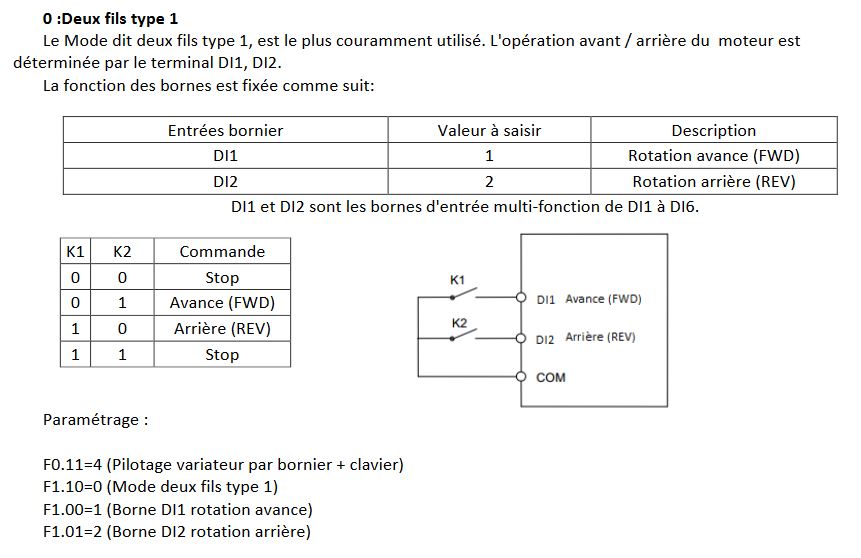 Les bornes DI1 et DI2 sont les entrées de commandes avant/arrière, regarde le guide de démarrage rapide vers la page 15 et suivantes ( https://document.technique-achat.com/IN ... REA_FR.pdf)