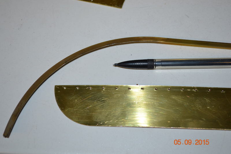 (Ph161a à 163) Le rivetage est une opération délicate sur une surface incurvée. Pour commencer, faire les trous dans les tôles à plat. Ceci en respectant les espaces entre rivets et tracer une ligne parallèle au bord. Puis se munir d’une pince à riveter (http://www.ateliermb.ch) et des rivets en laiton de 1x3mm. Commencer par la partie droite. D’abord contrepercer la cornière et y placer le premier rivet. Couper 1mm du rivet pour le réduire à 2mm de longueur.