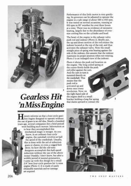 il est muni d'une regulation hit &miss ,son originalité se situe sur la commande de soupape d'echappement ,un cliquet leve la soupape une fois sur deux.les photos seront plus parlante... comme celui réalisé par Zéphyrin