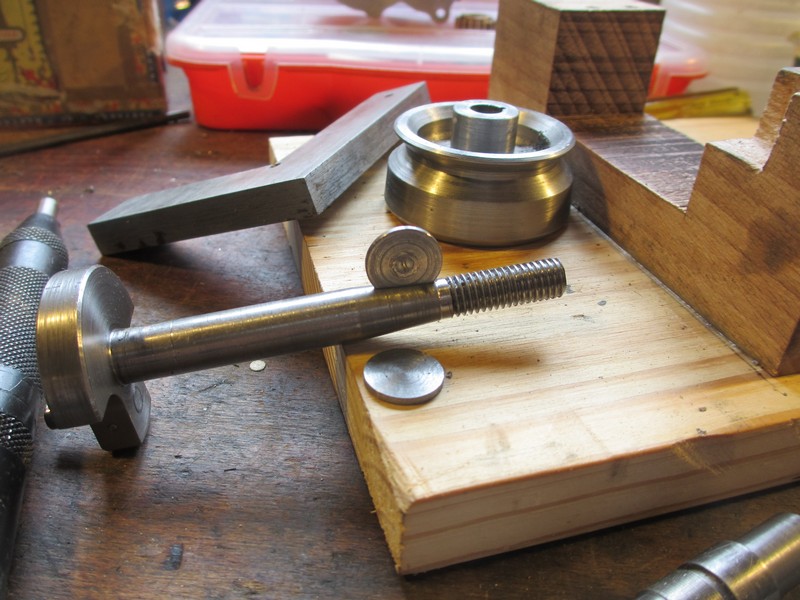 la taille de la rainure sur l'arbre est très facile, juste un petit coup de fraise disque tangentiel, avec une fraise disque "maison" d'une taille idoine que j'avais en stock. C'est là sans doute ou réside l'intérêt de cette clavette, il faut 2 min pour cette rainure... Par contre faire une rainure de hauteur constante sur le volant n'est pas facile à cause de la conicité de l'alésage; j'ai du faire un perçage avec le volant incliné entre l'alésage et un martyr conique pour ébaucher cette rainure, qui est finie à la main à la lime aiguille. et la clavette elle-même est simplement coupée dans un disque tronçonnée en acier dur.