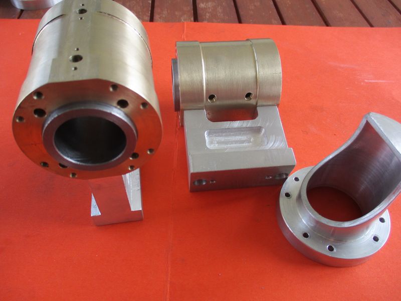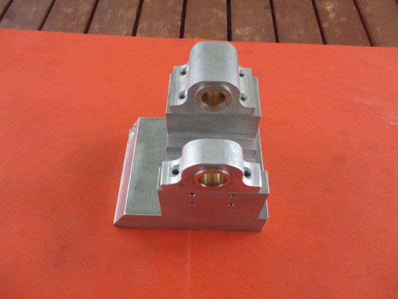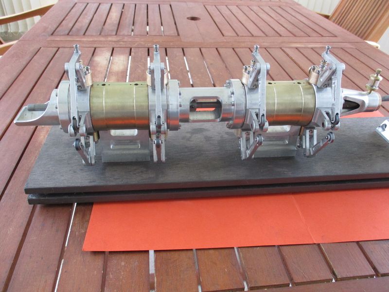 début d'un moteur bicylindres tandem a double effet ,une chambre de combustion de chaque coté des pistons ,d'apres les plans de Doug Kelley .