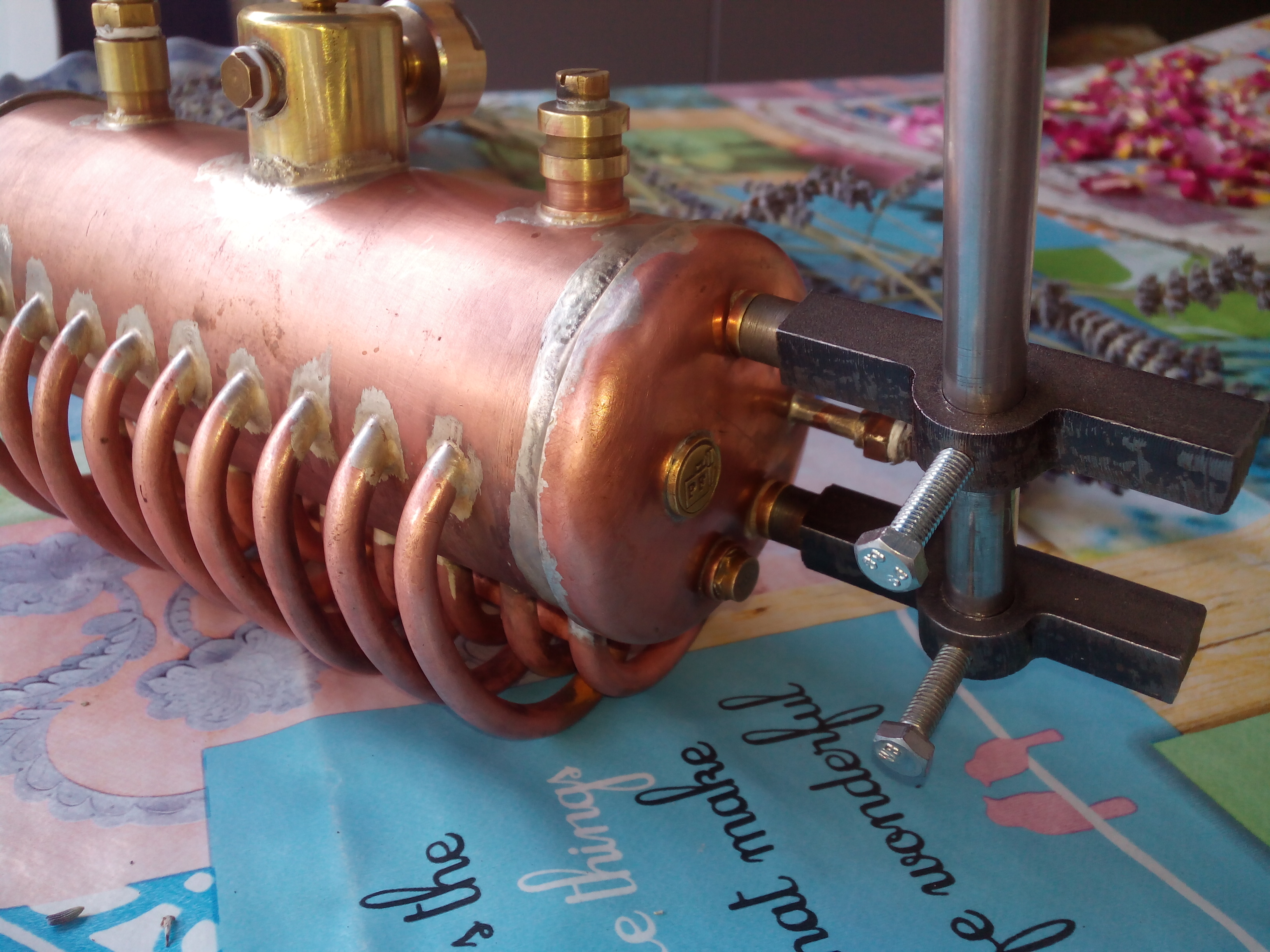 La chaudière fait 185mm de long pour un diamètre de 65mm. j'ai glissé dans chaque tube des anneaux en brasure d'argent pour faciliter la chauffe ainsi la brasure sera simplifiée.