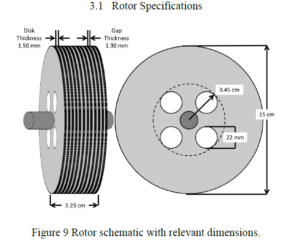 - la machine fonctionne via la viscosité du fluide (effet de couche limite) par conséquent l'état de surface doit être irréprochable et l'écartement des disques doit être de l'ordre de la couche limite : 0.2 à 0.5mm. Les disques font, en épaisseur, de l'ordre de 0.8 à 1.5mm pour les machines de laboratoire servant aux tests (diamètre rotor de 50 à 100mm)