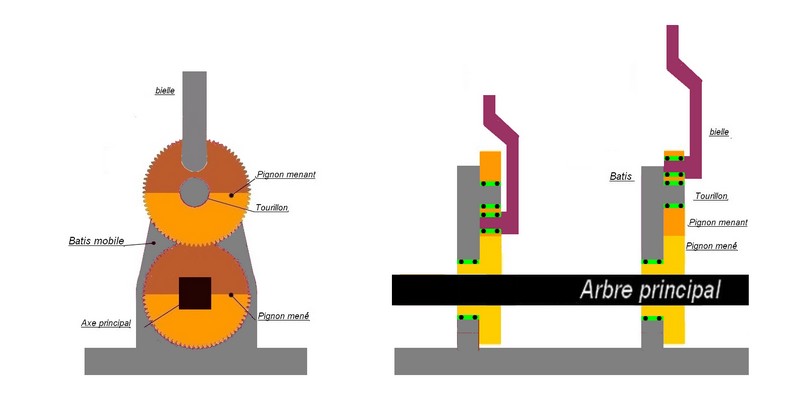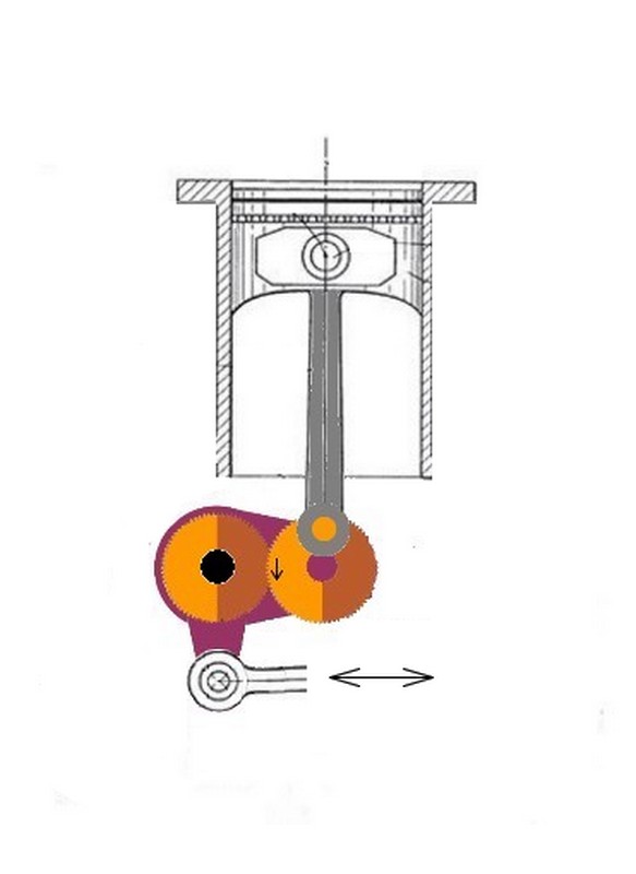 Ton pignon supérieur, menant, constitue exactement un vilebrequin entrainé par la bielle dans un mouvement de rotation. Les dents ajoutés sur la couronne entrainent l'arbre mené dans l'autre sens.