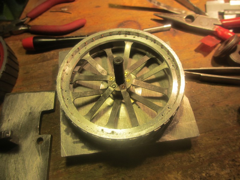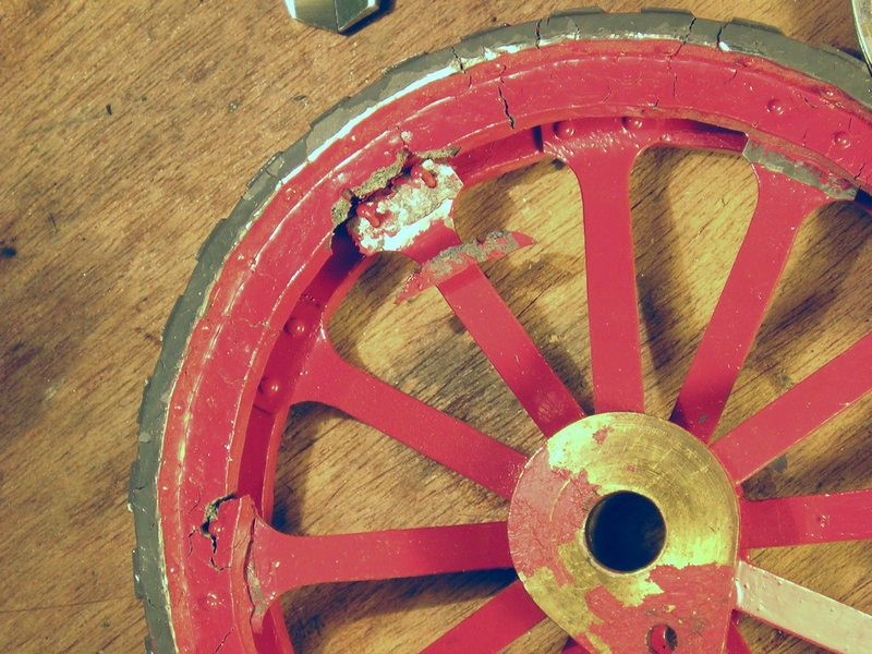 Mais hélas, mes fonderies de roues « maison » en alliage inconnu n’ont pas résisté au temps, du fait de la "Zinkpest", assez vite, les roues ont gonflé et sont parties en morceaux ! Je viens de terminer la remise en état : une roue avant et une roue arrière entièrement refaite J’ai usiné des jantes de roue arrière et avant à partir d’aluminium de bon aloi, et réutilisé les anciennes pièces en acier et laiton des moyeux, rayons et fers des semelles, en bon état; bien sûr, il a fallu refaire des supports de montage.