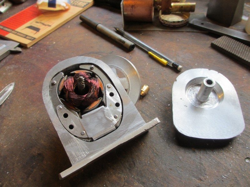 Electriquement, il me semble qu’il y a un sens de rotation préférentiel, ce qui m'étonne, et même parfois ce moteur ne démarre pas dans le « mauvais » sens ! Une mauvaise position des charbons, à potasser encore ! Les essais en générateur, avec la perceuse et une ampoule de lampe de poche sont satisfaisant, même si les puissances électriques de sorties sont modestes, avec l’ampoule 3.5V ; 0.2A comme charge.