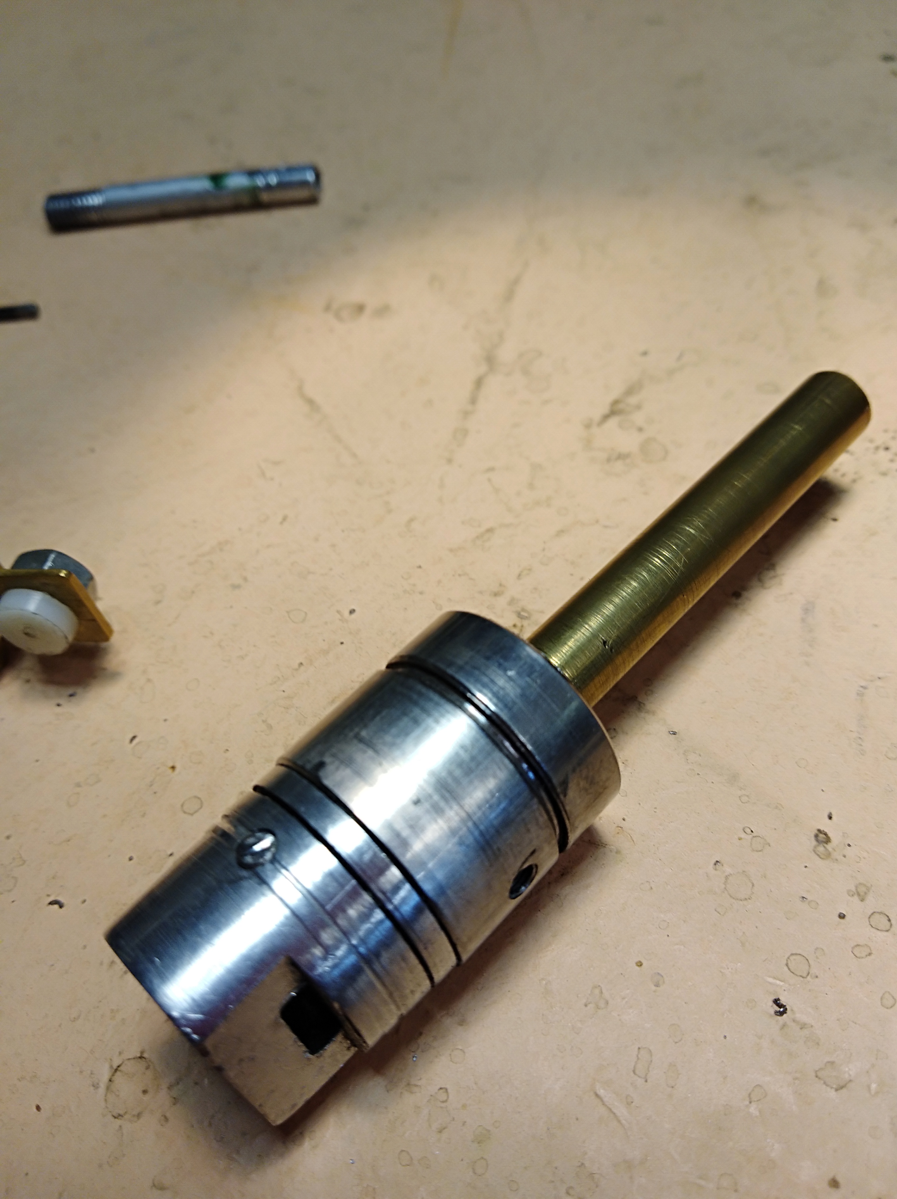Le cylindre de 8mm en laiton qui est solidaire du piston principal forme avec le cylindre central de 8mm solidaire du déplaceur un ensemble piston cylindre qui réagit à la différence de pression entre la pression atmosphérique et la pression interne dans le moteur (le cylindre de 8mm coté piston est relié à l'air libre: (à voir au sommet de la tête du piston). Dans la phase de compression (le piston principal descend), le petit piston (8mm) pousse le déplaceur (1,2 atm > 1 atm) vers le haut. Par contre dans la phase de détente, le petit piston aspire le déplaceur vers le bas (0,8atm < 1atm). C'est par l'intermédiaire des 2 petits cylindres de 8 mm coulissants (et guidants) que le déphasage entre piston - déplaceur est effectué. Dans ce moteur je pense que l'on pourrait diminuer le diamètre du petit piston de 8 à 7mm pour emprunter moins d'énergie (de force) au moteur pour actionner le déplaceur (amélioration du déphasage et choc moins important).