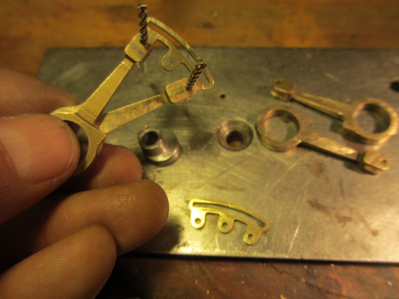 Les passages vapeur sont déjà très petits, une ouverture circulaire retarderait de 40° de manivelle la pleine ouverture des lumières. Les pièces s’accumulent à la longue, j’arrive au bout de l’ensemble mécanique ; bielles excentriques (bronze) et coulisse (laiton), leviers et biellettes (acier), tiroirs (laiton), pistons (bronze) et toute la visserie spéciale en acier 6pans (clés Allen Ikea) pour les axes des biellettes et des vis à téton pour que les bielles excentriques restent en place sur une rainure sur leur excentrique. Heureusement j’avais déjà fait le mandrin cloche pour cette opération !