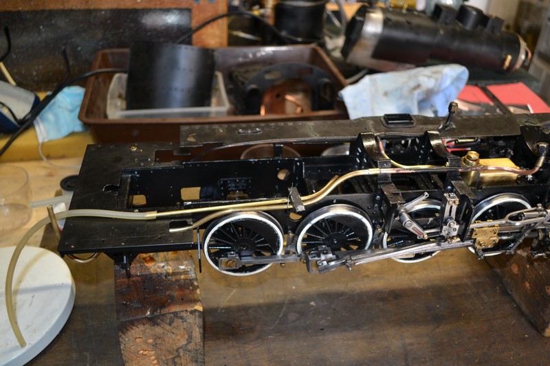 l'alimentation de la chaudière par la pompe à eau du tender nécessite un exercice de plomberie assez tortueux car les passages possibles sont rares compte tenu du foyer crampton qui occupe tout l'espace entre les longerons.