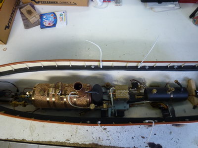 l'ensemble vapeur comprend un detendeur une vanne coupe gaz un regulateur double membrane.le moteur est un bicylindre distribution maudslay (plants trouvés sur bateau model) c'est un moteur qui marche trés bien.les plants sont trés bien fait,c'est seulement le deuxieme moteur que je construit et il a fonctionné tout de suite de plus il est trés facile a regler