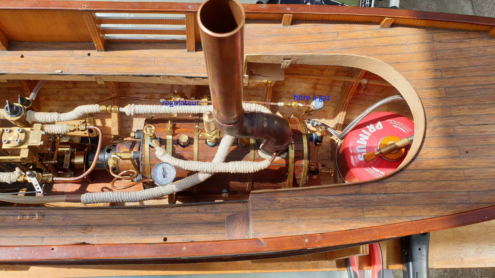 l'echappement vapeur etait prévu dans la cheminée pour faire un beau panache (et effectivement joli...) mais l'efficacité relative du deshuileur et la production d'eau transformait la chaudière en cafetière l'eau se revaporisait dans la cheminée et après un petit arrèt de 2 mn à la remise en marche l'eau et l'huile sont ressorties par les prise d'air du bruleur ... donc refonte du système (sur la photo c'est l'ancien) et réutilisation du tuyau de sortie vapeur au niveau de la coque que le proprio précedent avait bouché avec un rond de laiton de plus d'1 cm de long !! facile à repercer ! :evil: