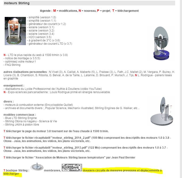 J'ai moi même acheté tout ça pour le mettre sur un Stirling quand j'en aurais un prometteur. Je pensais pas à celui là mais finalement il fonctionne si bien malgré son manque d'optimisation que je vais l'installer dessus. Là avec ce matos, j'affiche la pression en instantané sur l'écran ainsi que d'autre paramètres qui sont la température récupérée par 2 sondes (une pour le coté froid une pour le coté chaud) et a vitesse de rotation grâce à ceci : http://tiptopboards.com/215-capteur-de- ... tique.html. Mais ce qu'il faut que je fasse, surtout, et ce que je ne suis pas encore parvenu à faire, c'est de récupérer dans un tableau les valeurs mesurées par le capteur de pression en fonction de la position du vilebrequin. Ce qui me donnera le vrai diagramme P/V. Jusqu'ici j'ai programmé mon arduino tout seul en glanant des infos sur le net et comme j'ai quelques notions de programmation ça a été tout seul. Y a pas mal de taf pour tout faire fonctionner. Mais pour faire mon acquisition de donné, là ça se complique. Et ça tombe bien car vendredi j'ai appris qu'il y aurait un ingé à mon taf qui maîtrisait bien l'arduino. Dès demain je vais voir ça avec lui.