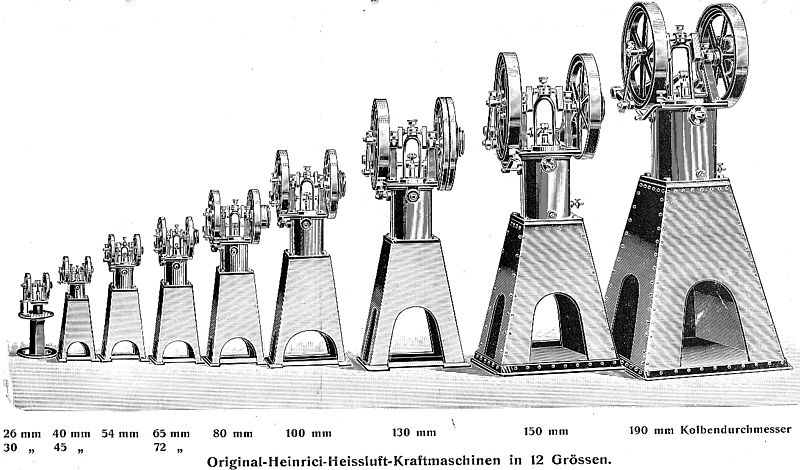 Je pense qu'il y a une confusion dans le catalogue Adnet, les petits moteurs sont du type Henrici (= béta), et Adnet était sans doute simplement revendeur, les modèles supérieurs sont notés comme ayant un fonctionnement identique, mais sont de toute évidence des moteurs gamma à cylindres parallèles et le refroidissement se faisant par les ailettes en étoile autour du haut du cylindre déplaceur.