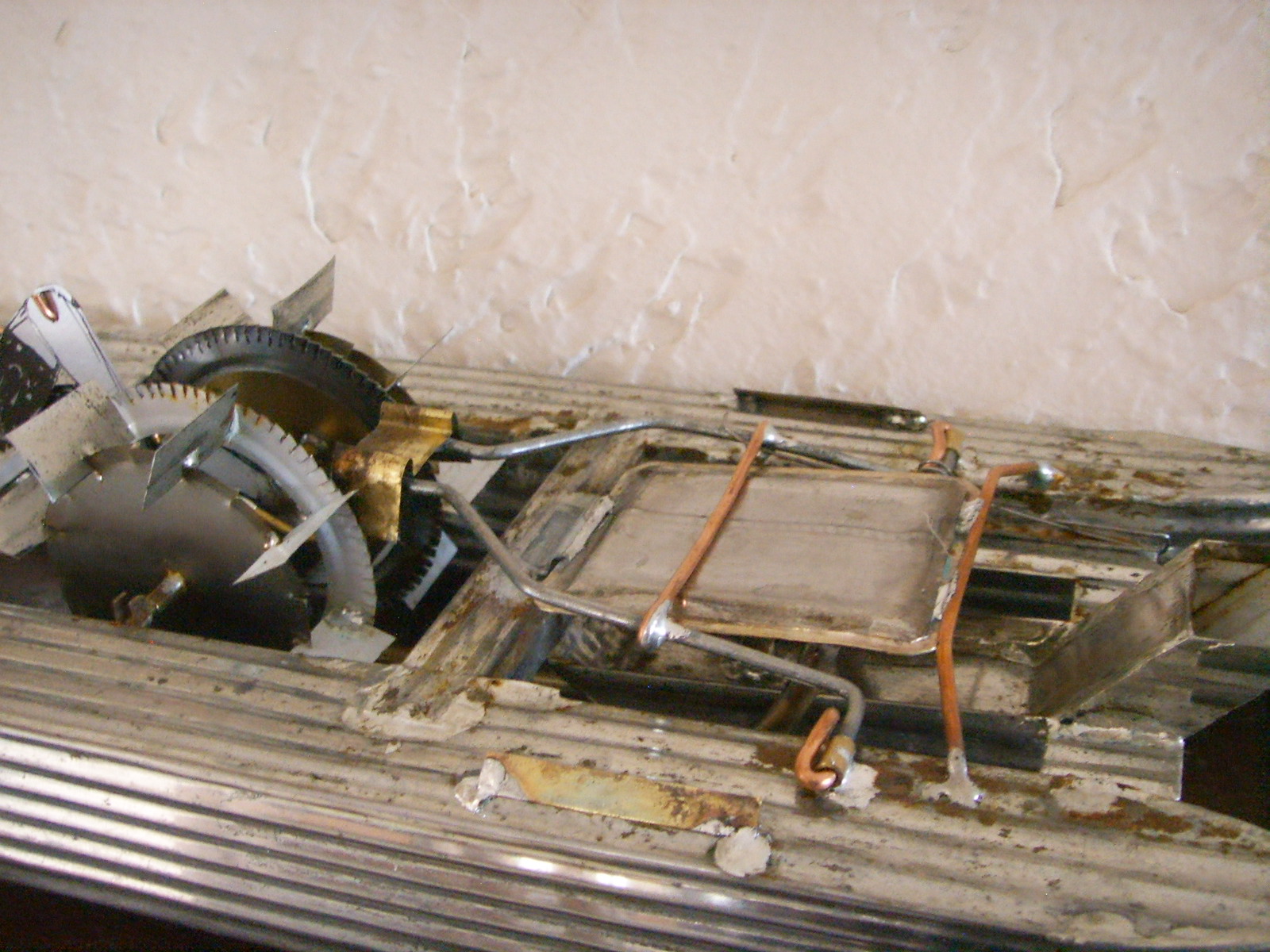 A l'origine, il s'agissait d'une propulsion pop-pop classique, et j'avais dirigé les tuyères du moteur sur les aubes du bas, immergées, en espérant faire tourner les roues. Je n'ai jamais réussi par ce moyen, la puissance des jets étant trop faible, et aussi à cause de l'aspiration de l'eau par ces tuyères, annulant presque l'effet de la poussée.