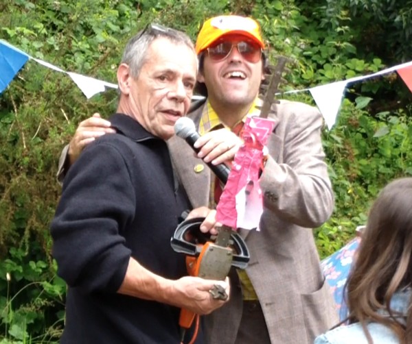 Photo de Patrick recevant des mains de l’animateur un taille-haie HS "généreusement offert par la déchetterie de Peillac".