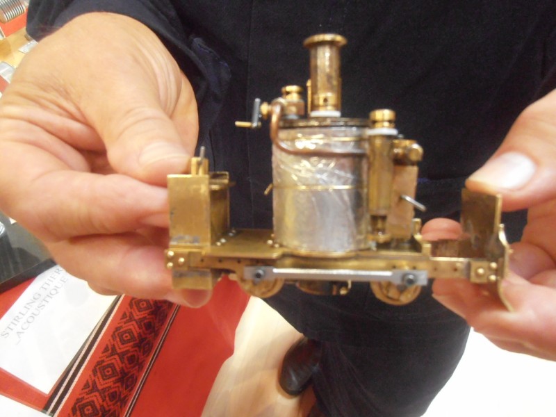 vue ce weekend au salon de gien une mini loco bicylindre oscillant,Ø des pistons 4 mm,reservoir à gaz,chaudiere Ø 28,bruleur avec des trous Ø 0,5,graisseur .elle a tout d'une grande enfin presque