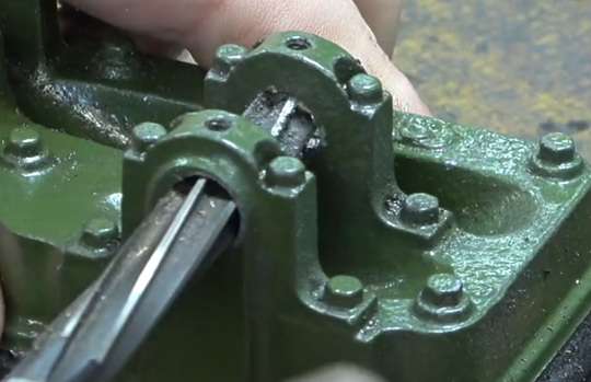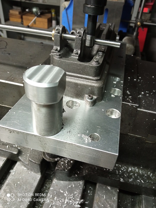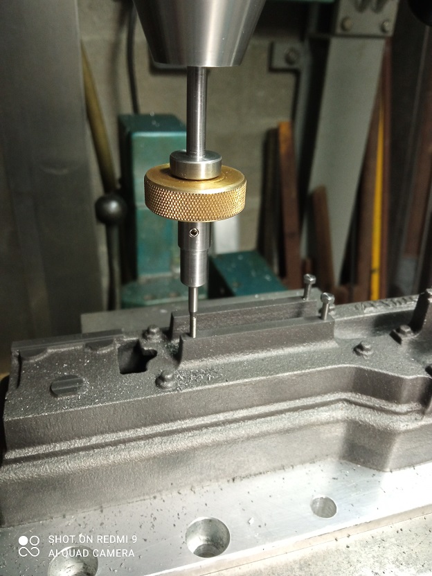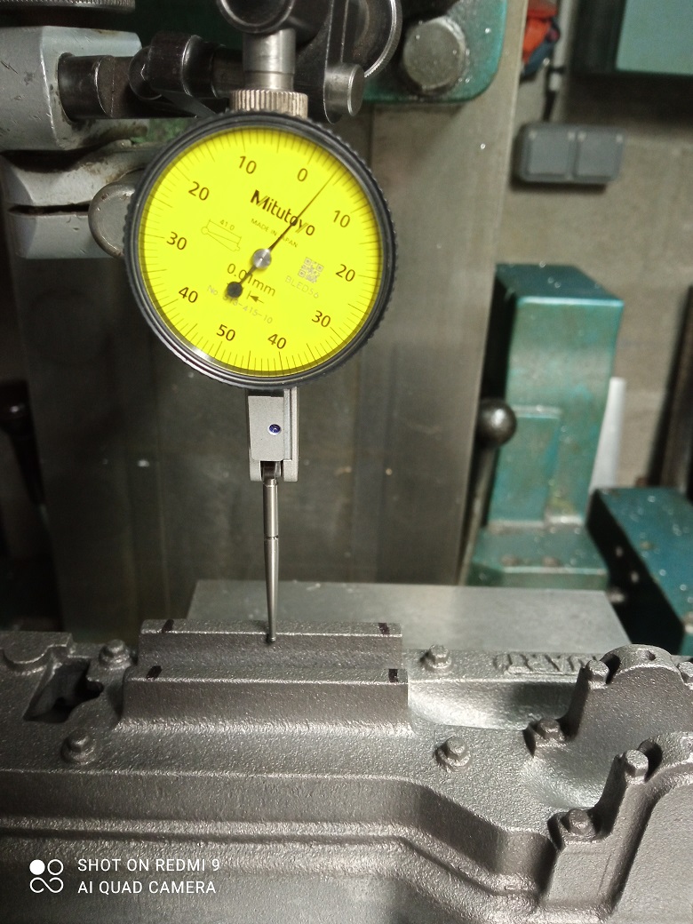 tu cales ensuite le cylindre horizontal sous la fraiseuse avec 2 Vés et un barreau dans l'alésage pour l'usinage de la glace de distribution. la hauteur d'usinage est facile à déterminer. les cotés de la glace sont usinés aussi sans démonter.