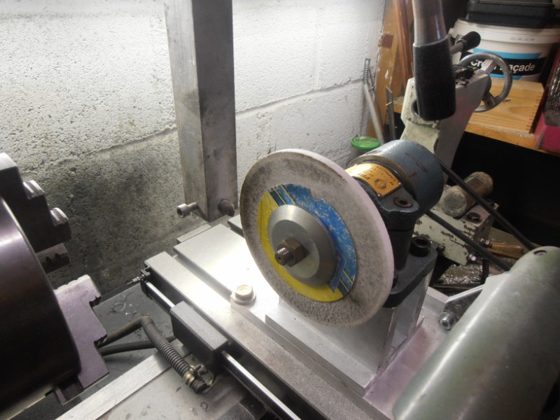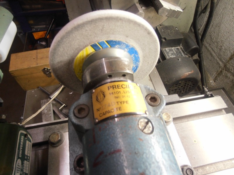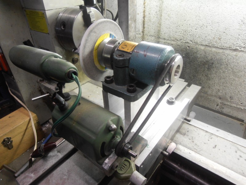 réalisation avec les moyens du bord d'une rectif montée sur le tour,le moteur 220v 2 vitesses provient d'une machine à coudre ,un moyeu porte meule récupéré .