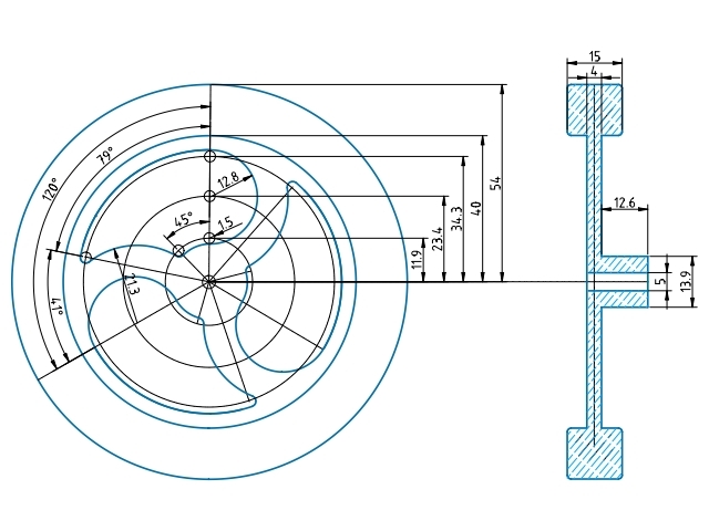 J'en avais déjà fait un à 5 branches il y a quelques temps, il y avait effectivement du travail de fraisage. Avec ce trois branches, j'ai simplifié, moins de travail de montage sur le banc et au niveau de traçage, les arcs de cercles des rayons sont concentriques donc plus simple en réalisation.