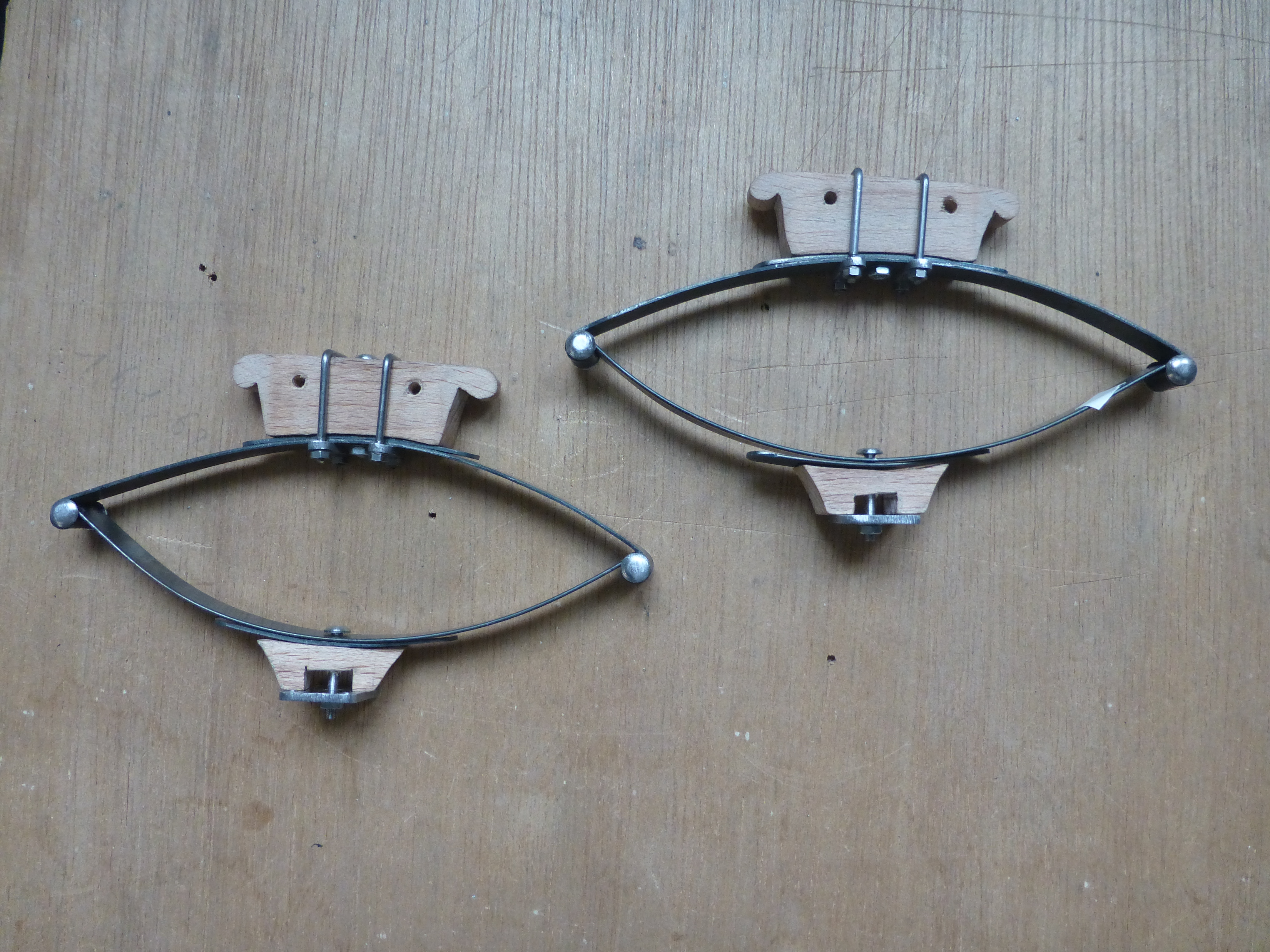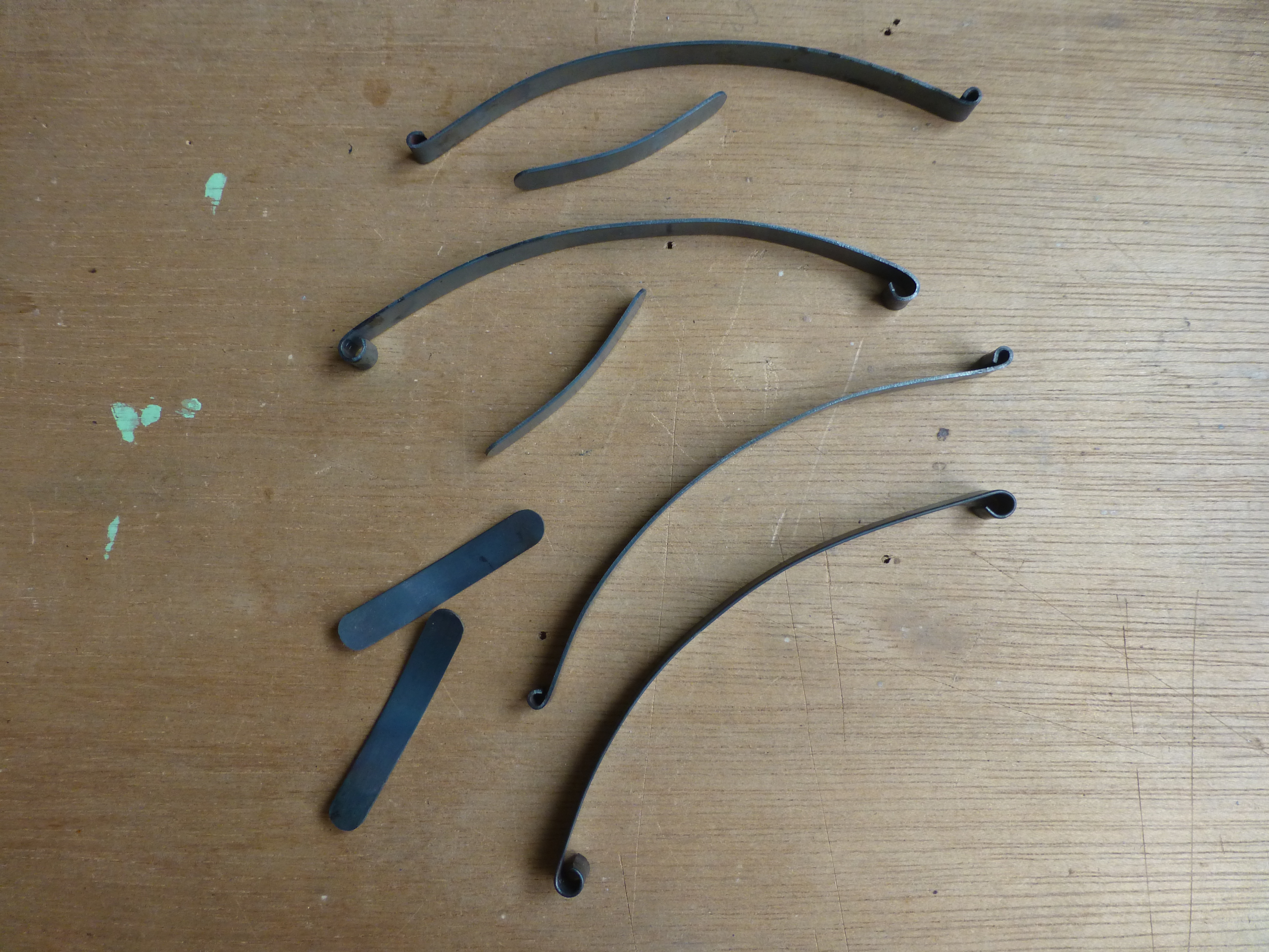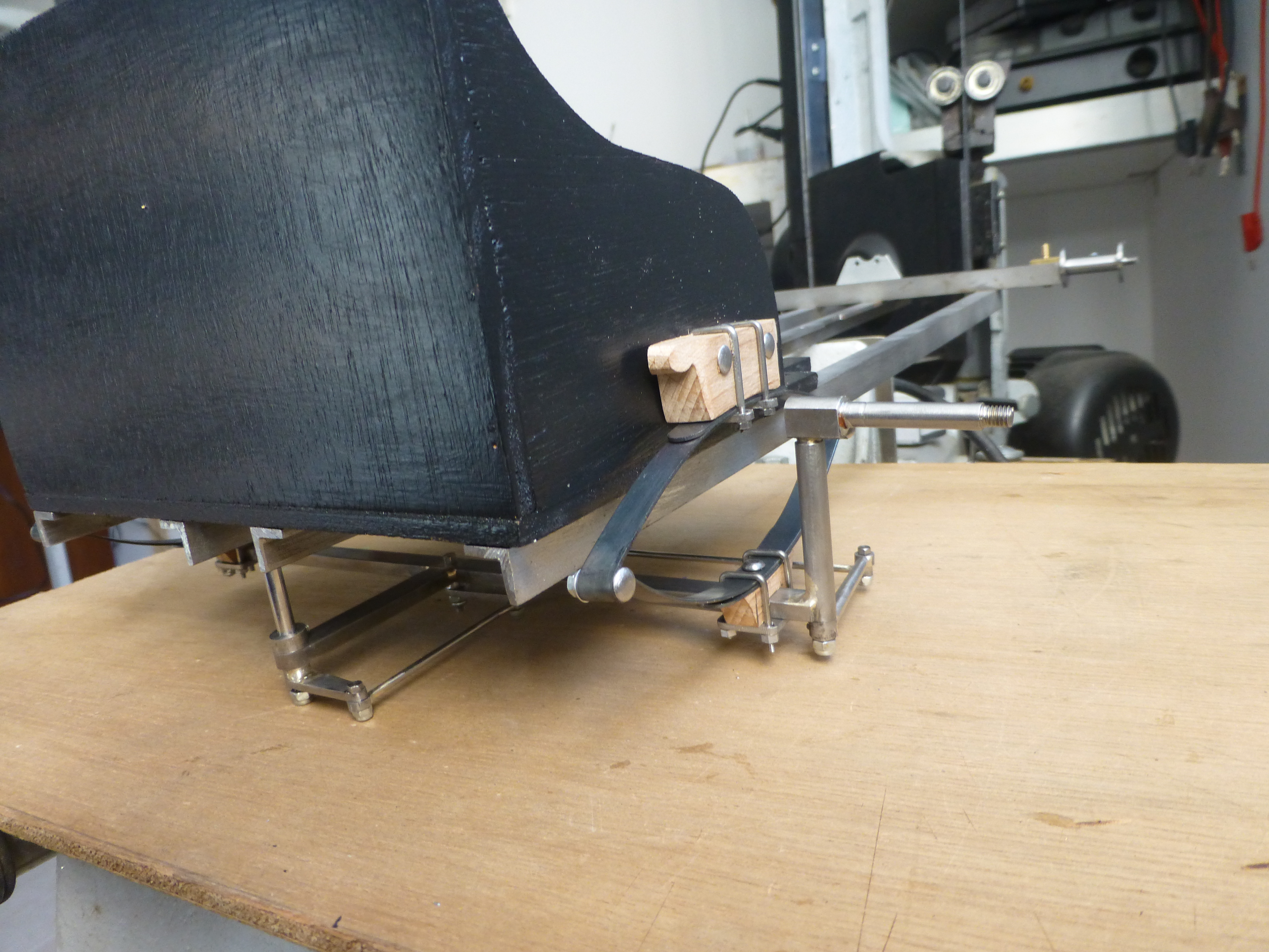 la suite du train avant avec les lames de ressort dans un acier a ressort trouvé dans mon bazar a la bonne largeur ,du coup les suspensions seront fonctionnelles puis fixation du train avant sur la caisse