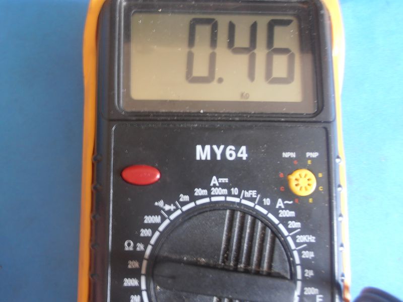 sur la resistance il y a d'ecrit 470RK,en mesurant avec le multimetre sur l'echelle 20K on a 0.46