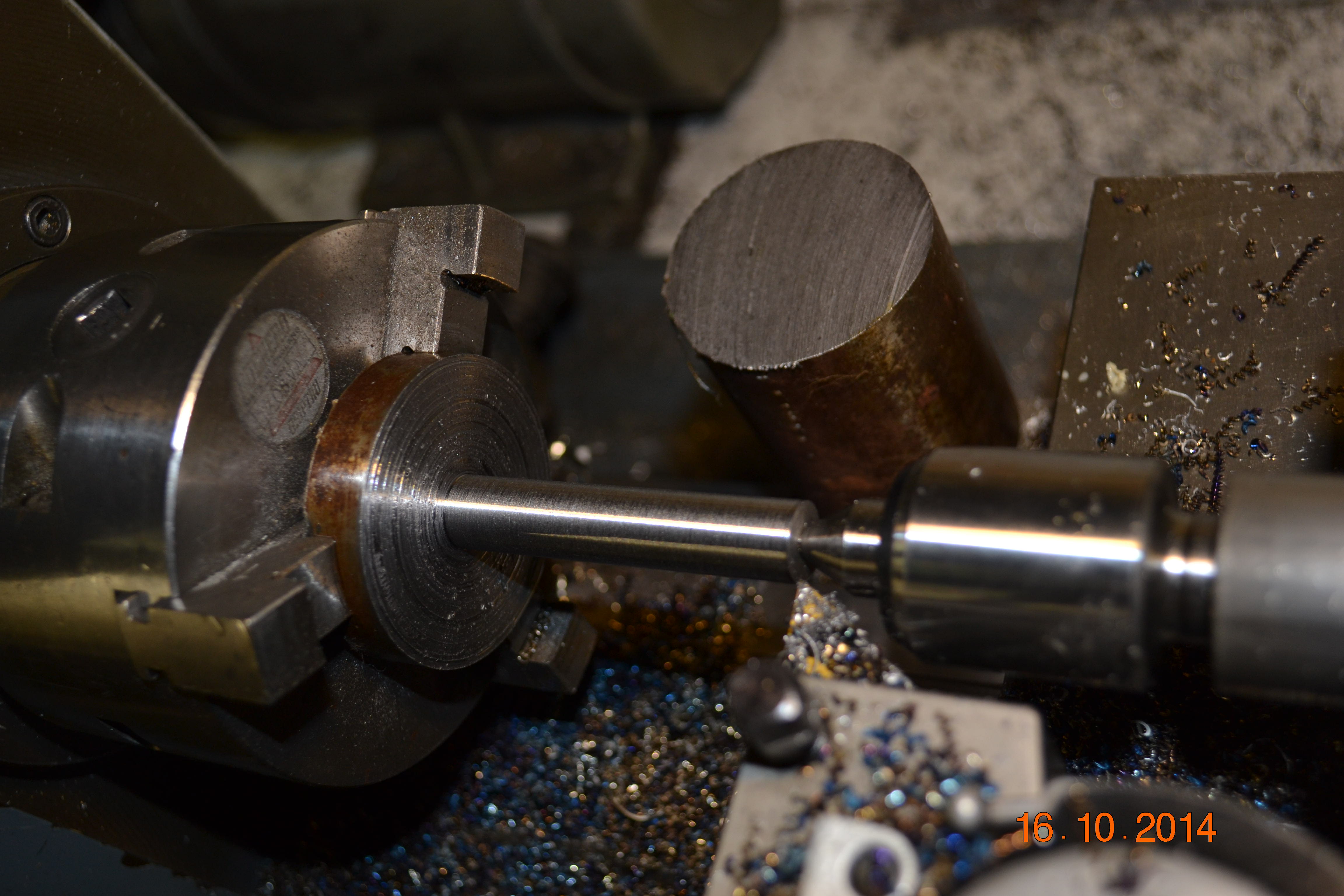 (Ph 21) Usinage sur le tour du filet de fixation du volant. Le fait d’exécuter cela à la machine garanti le parfait centrage de la vis.