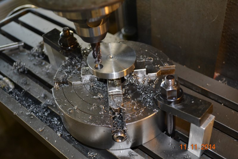 (Ph 23 & 24) Ce montage est celui qui me semble le plus rationnel pour respecter l’orthogonalité des axes, ainsi que la distance entre les deux axes. Dans le cas présent, je me sers du voile de vilebrequin pour la MàZ. Dès que la pièce est parfaitement centrée, on peut excentrer. Ensuite aléser par palier successif pour finir avec une fraise en bout de série courte, ceci pour limiter la flexion de l’outil. La dernière passe doit être de maximum 0.5mm, ceci pour éviter les vibrations et/ou torsion de la pièce. Les contraintes inutiles vont diminuer la précision d’usinage. La cote finale de cet alésage n’as aucune importance, vu que la dimension du maneton seras adaptée en conséquence. Il peut y avoir une erreur au niveau de l’entr’axe, cela à peu d’importance qu’il y a un dixième de plus ou de moins. La cylindrée finale variera de quelques fractions de cc. Toutefois, l’erreur dois être rigoureusement la même sur les deux flasques.