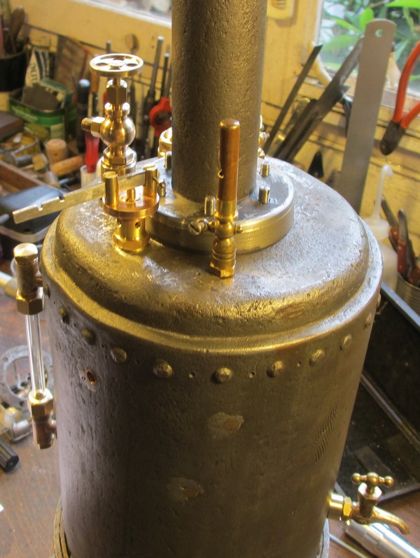 Le niveau d’eau avec son tube de verre 8 mm parait loin de la chaudière, mais il y aura un calorifugeage en liège 6mm et une tôle, réellement indispensable d’après mes essais préliminaires avec cette vieille chaudière mal conçue.