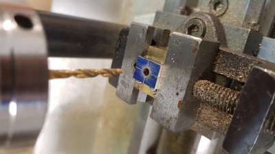 J'ai hésité à tarauder le trou central pour la tige de bielle dans la même opération mais j'ai décidé de le faire plus tard, car le perçage du trou de manivelle aurait alors débouché dans un trou M2 à mi course. Grand risque de bloquer le forêt et de tout arracher !