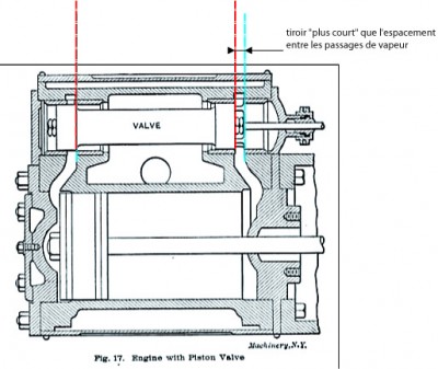 Il n'y a pas de recouvrement car la distribution est totalement symétrique, l'inversion de marche se fait par inversion des conduites admission-échappement, exactement comme avec un moteur oscillant, et non par le décalage de l'excentrique, comme sur un "vrai" moteur à vapeur...
