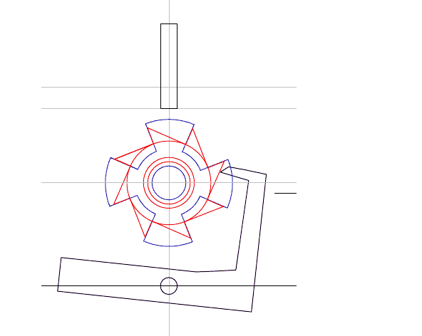 Pour remplacer l'arbre à came et ses engrenages, c'est pas facile...j'essaie un truc dans ce genre là, animé par un excentrique, qui comporte une roue à cliquets (en rouge) qui fait tourner une butée en croix (bleue) qui pousse un tour sur deux le poussoir de soupape d'échappement, la soupape d'admission sera automatique... pas simple comme bidule, il faudra incorporer des ressorts un peu partout, délicat à régler je le crains. comparé à des engrenages l'avantage n'est pas évident !
