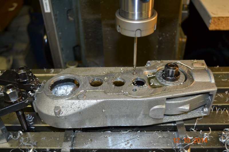 (Ph 23 & 24) Ce montage est celui qui me semble le plus rationnel pour respecter l’orthogonalité des axes, ainsi que la distance entre les deux axes. Dans le cas présent, je me sers du voile de vilebrequin pour la MàZ. Dès que la pièce est parfaitement centrée, on peut excentrer. Ensuite aléser par palier successif pour finir avec une fraise en bout de série courte, ceci pour limiter la flexion de l’outil. La dernière passe doit être de maximum 0.5mm, ceci pour éviter les vibrations et/ou torsion de la pièce. Les contraintes inutiles vont diminuer la précision d’usinage. La cote finale de cet alésage n’as aucune importance, vu que la dimension du maneton seras adaptée en conséquence. Il peut y avoir une erreur au niveau de l’entr’axe, cela à peu d’importance qu’il y a un dixième de plus ou de moins. La cylindrée finale variera de quelques fractions de cc. Toutefois, l’erreur dois être rigoureusement la même sur les deux flasques.
