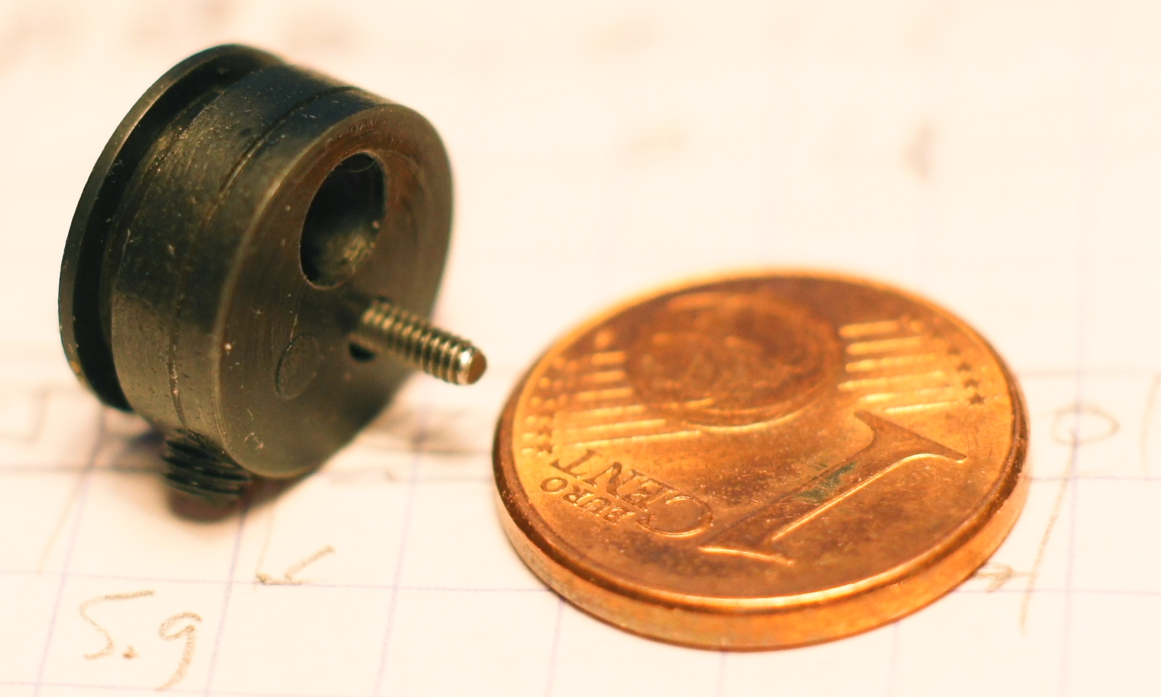 Sur le fond du cylindre une tige filetée laiton M3, épaulée/filetée M2,5, à améliorer.