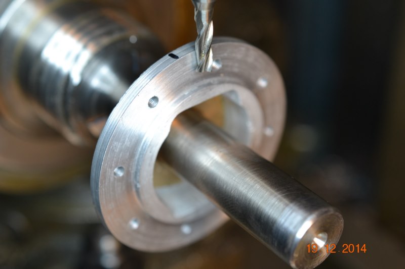 (Ph61 & 62) Pour usiner correctement l’axe des planétaires, j’ai collé à la Loctite forte un axe martyr, puis fixer ainsi le demi-carter dans le diviseur de la fraiseuse. Effectuer les MàZ d’usage, monter le second demi-carter et procéder au fraisage en ligne des deux demi-carters.