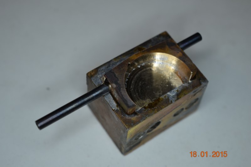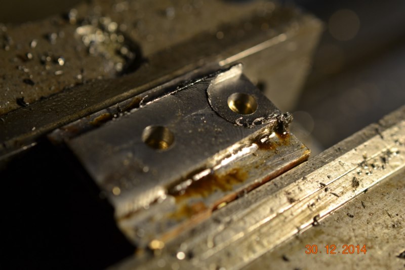 (Ph102 à 107) C’est la fourchette de commande d’embrayage. Partis d’un bloc de bronze soudé sur un martyr. L’axe de commande est soudé à l’argent car en définitive, il sera sectionné dans la phase d’usinage. Toutefois, la concentricité des deux demi-axes sera parfaite. Le montage dans le carter a demandé un peu de réglage fait à la Dremel.