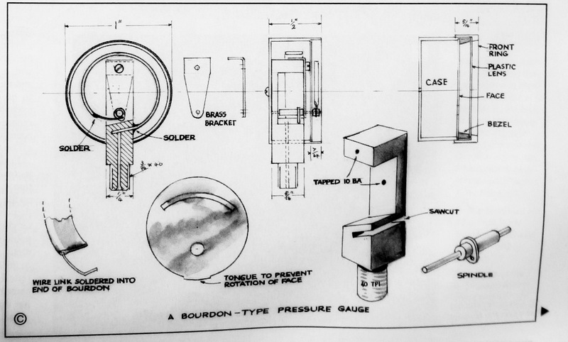 Voila un schéma des pièces, mais je pense que la biellette (wire link) ne devrait pas être soudée au tube Bourdon, mais comme sur la photo de ma bricole, insérée dans un petit tube, pour une meilleure liberté de mouvements.