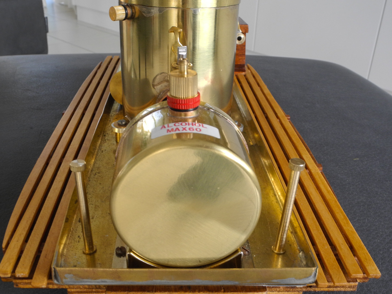 -chaudière (SAITO) de petite taille et moteur (MICROCOSM bi-cylindre oscillant) peu important : je m'en fiche, l'ensemble m'assure 20 minutes de fonctionnement sans problème et j'ai la candeur de trouver, sans évidemment vouloir froisser personne, que les bateaux- modèles, qu'ils soient à vapeur ou électriques, vont toujours trop vite. Ce sera donc, avec cet ensemble un peu poussif, une de mes seules concessions à un certain réalisme. D'où, aussi une totale absence de recherche de performance et donc de technicité pointue (de toutes façons je n'en suis pas capable)