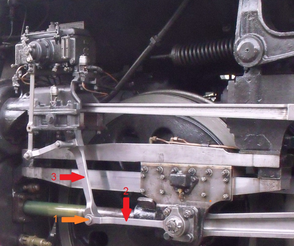 Je n'ai pas de photos des pièces défectueuses, mais voilà l'explication de l'arrêt: L'axe 1 est sorti (perte goupille), les bielles 2 et 3 se sont percutées et pliées, résultat plus de graissage par le graisseur Nathan (au dessus). Remise en route à 5km/h avec un personnel qui faisait fonctionner le graisseur manuellement.