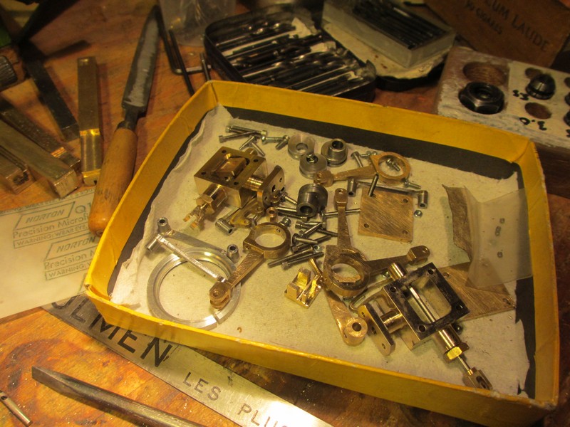 Les passages vapeur sont déjà très petits, une ouverture circulaire retarderait de 40° de manivelle la pleine ouverture des lumières. Les pièces s’accumulent à la longue, j’arrive au bout de l’ensemble mécanique ; bielles excentriques (bronze) et coulisse (laiton), leviers et biellettes (acier), tiroirs (laiton), pistons (bronze) et toute la visserie spéciale en acier 6pans (clés Allen Ikea) pour les axes des biellettes et des vis à téton pour que les bielles excentriques restent en place sur une rainure sur leur excentrique. Heureusement j’avais déjà fait le mandrin cloche pour cette opération !